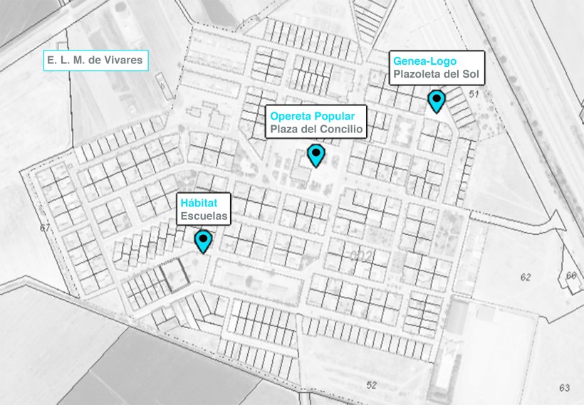 «Vivares es uno de los cuarenta y dos pueblos que el Instituto Nacional de Colonización construyó a mediados del siglo XX a raíz de la puesta en marcha, concretamente en 1952, del Plan de Badajoz. El proyecto del pueblo de Vivares fue encargado el 24 de octubre de 1960. Las obras de ejecución se llevaron a cabo bajo el diseño del arquitecto Perfecto Gómez Álvarez y el aparejador José Benito García. Vivares, como el resto de pueblos de colonización, comprende una especial y moderna fisionomía dentro del panorama urbano y arquitectónico nacional. Se diseñó con un programa de equipamientos totalmente organizado, integrado por edificios públicos (Iglesia con campanario, Ayuntamiento, Escuelas, Edificio Social, Cooperativa, etc.) y viviendas para obreros y colonos. Una especie de pueblo-tipo caracterizado por su trama urbana, la singularidad de los materiales constructivos empleados, la composición formal de las edificaciones de carácter marcadamente moderno y la riqueza artística de las obras que decoran la Iglesia Parroquial.